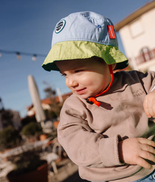 Découvrez le Bob pour enfants et bébés, Mini Fresh. Style bicolore iconique, éco-responsable, avec attache, parfait pour les jours chauds. Un bob confortable, facile à porter, disponible dès 3 mois.